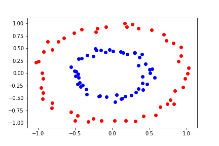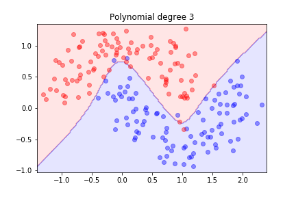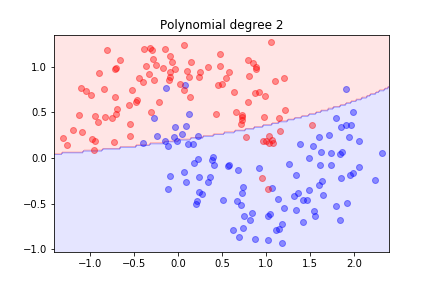 $$ (x, y) \rightarrow (x, y, x^2, y^2, xy)$$we increase our separating power. Effectively we allow the straight lines in the linear model to become arbitrary curves if enough polynomial orders are added.