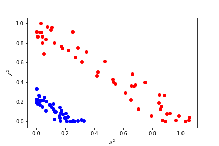 In order to be able to separate the two sets linearly. We need to process the data before it is possible. If instead of trying to separate the datasets using $x$ and $y$ we can use transformed features. Let's use $x^2$ and $y^2$.